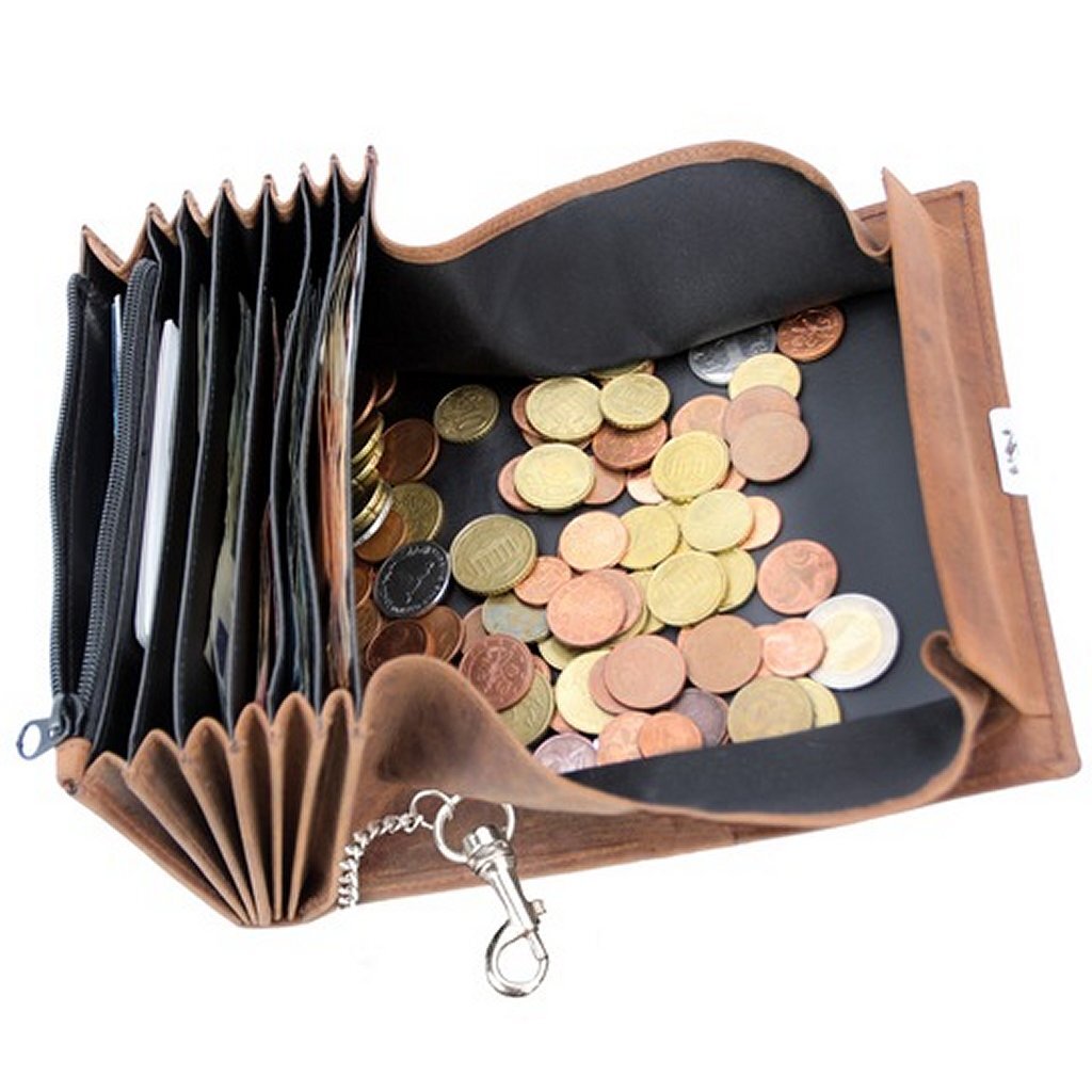 Bruine kelnerportefeuille met zes opbergvakken voor biljetten, portemonnee, compartiment met ritssluiting, compartiment aan de achterzijde met instelbare sluiting met 3 posities. Buitenmaat ca. 18,5 x 9,5 cm. Materiaal: hunter leer.