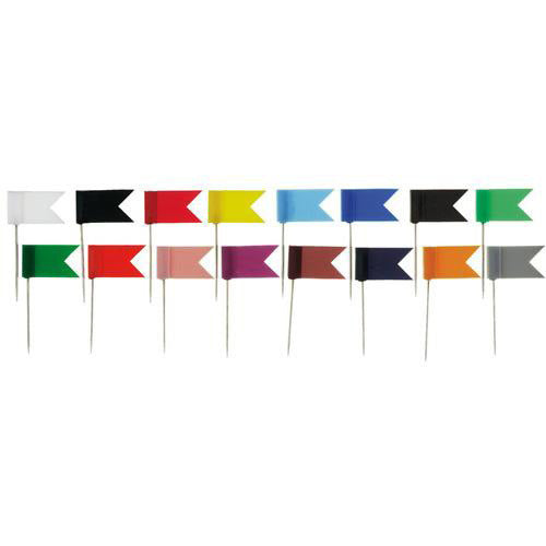 Deze markers in de vorm van vlaggetjes 'wapperen in de wind'. Je kunt ze gebruiken als markeringsvlaggetjes om bijvoorbeeld aan te geven waar je geweest bent op de wereldkaart. Deze signalisatiespelden zijn geschikt om in een prikbord of andere zachte ondergrond te prikken. 20 stuks in doosje. Kleur assorti. De aantallen in kleuren kunnen verschillen