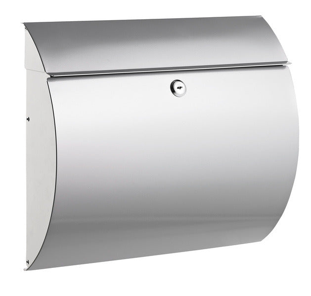Brievenbus met een tijdloze afgeronde vorm. Metaal, zilver gelakt, voorzien van slot met 2 sleutels. Bevestigingsmateriaal bijgesloten. Formaat 375x330x120mm.