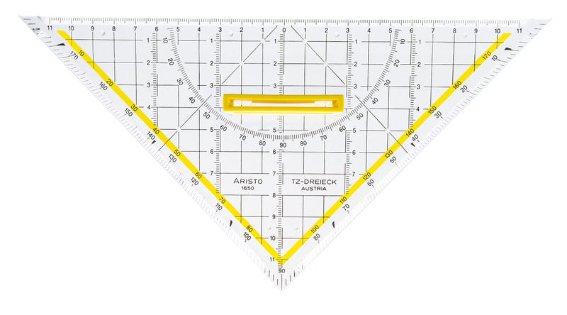 Multifunctionele tekendriehoek. Te gebruiken als liniaal, driehoek en parallelliniaal. Met horizontale en verticale schaalverdeling. Met afneembare greep. Met een facetgeslepen zijde aan de lange kant en inktnoppen aan de onderzijde. Voldoet aan de ÖNORM A2134. Lengte 25 cm. Materiaal: aristopal. Transparant.