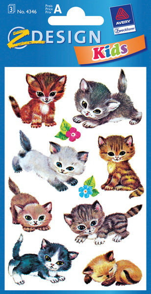 Kleurrijke papieren stickers, deels met glitters of reliëf. Formaat vel 76x120mm. Aantal vel 3. Motief katten.