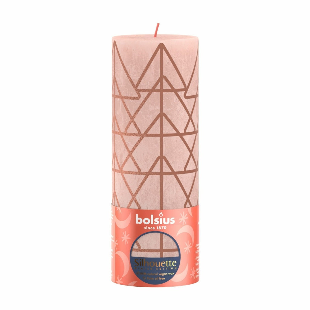 Deze klassieke rustieke Bolsius kaars in de kleur Misty Pink met printheeft een afmeting van 19 x 6,8cm. De kaars brand na ca. 65uren op en roet niet.