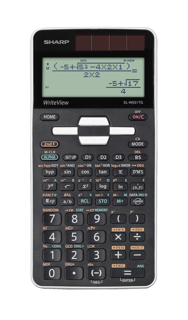 Wetenschappelijke solar schoolcalculator met WriteView display en D.A.L. input (display zoals in het leerboek) in het nieuwe ontwerp. Startknop voor betere navigatie, 4-lijns display met 96 x 32 dot matrix met een Acrlyglas beschermlaag, TWIN power (zonne-energie en back-up batterij), 422 functies, 4 short-cut knoppen voor directe toegang tot veelgebruikte functies van het 2e en 3e bezettingsniveau (D1-D4), nBasis berekeningen (dec, hex, oct, bin, pen) en logische operators, extended RANDOM, oefeningen mogelijk met trainingsfunctie (DRILL), multi-line weergave, 9 geheugen, statistische functies met 1/2 variabele: afmetingen (LxBxH mm): 80 x 168 x 14. Kleur: zwart-wit. Batterij: 1 x LR44.