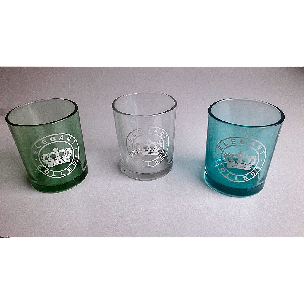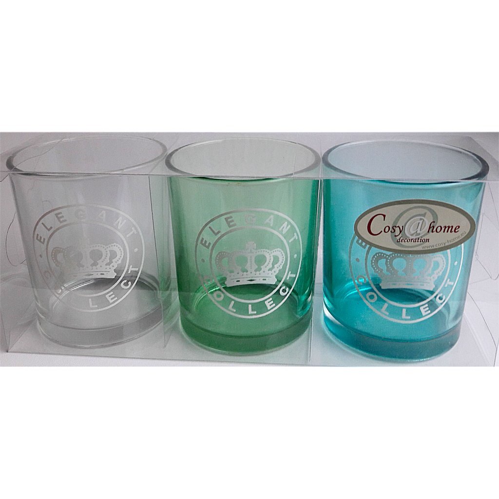 3 stijlvolle Elegant Collect theelichthoudersvan Cosy Home in groen, blauw en doorzichtig glas.De diameter van de theelichthouder is ca. 6 cm en de hoogt is ca. 7,5 cm.
