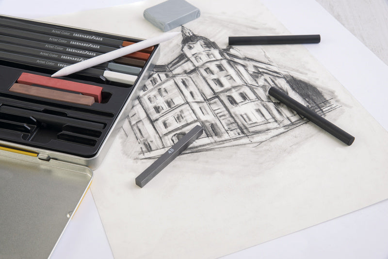 Inhoud: 1 tekenpotlood 8B, 3 x geperst houtskool ( soft, medium en hard), 1 kneedgum, 1 doezelaar, 1 metalen puntenslijper, 2 x pastelkrijt (kleur :sanguine gebrand en van Dyck bruin), 2 grafietpotloden (4B en 6B) en 5 kleurpotloden in de kleuren wit, walnootbruin, bloedrood, warmgrijs en donker sepia. De potloden hebben een kerndiameter van 3,8mm.