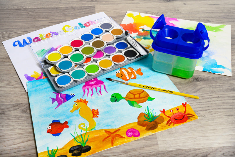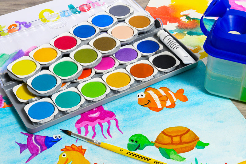 Mooie stevige bewaarbox met (24 verschillende kleuren) waterverf tabletten van uitstekende kwaliteit, lichtvast, helder van kleur met diepe kleurpigmenten. In deze set zit ook een penseel, mengpalet en een tube dekwit. De verf kan ook makkelijk gemengd worden. Het penseel kan worden opgeborgen in een apart vak zodat het (natte) penseel niet in aanraking komt met de verf. Met 24 wisselbare verfnapjes. Veilig voor kinderen.