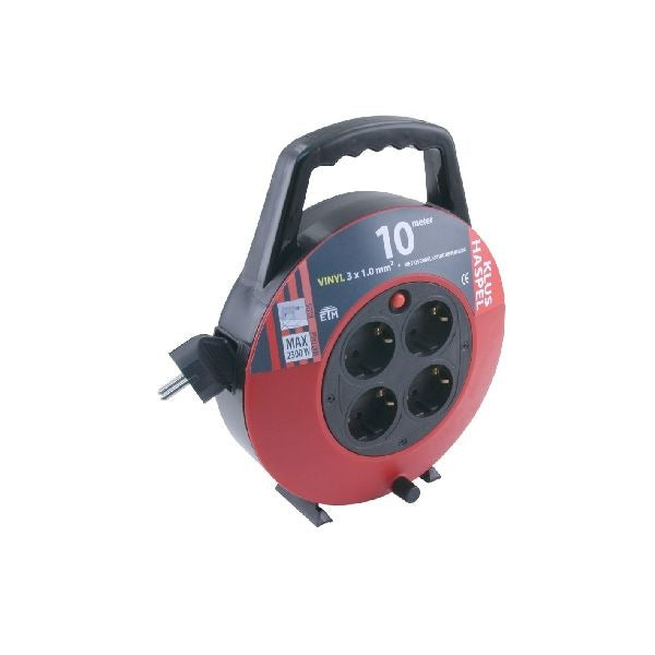Klus Kabelhaspel voor Binnen 10 Meter. Max. 2300 Watt, opgerold maximaal 750 Watt. Vinyl kabel. Met overbelasting beveiliging.