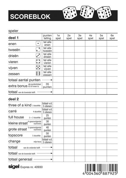 Scoreblok voor het bekende Yahtzee spel. 100 vel. Formaat 105 x 148 mm.