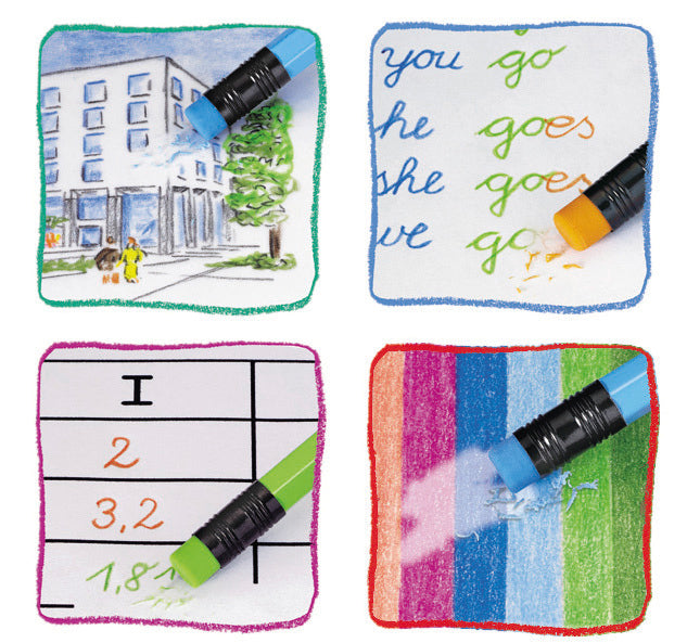 Kleurpotloden. Uitwisbaar. Heldere kleuren met speciale verlijming om breken van de stift te voorkomen. Op water basis eco paint en tekstvak op de schacht om eigen naam te vermelden. Kartonetui à 12 st.