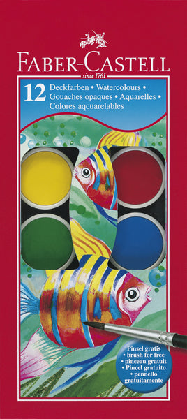 Waterverfdoos. Doos met 12 heldere en intensieve kleuren. Napje van 3 cm diameter. Inclusief penseel. In water oplosbaar.