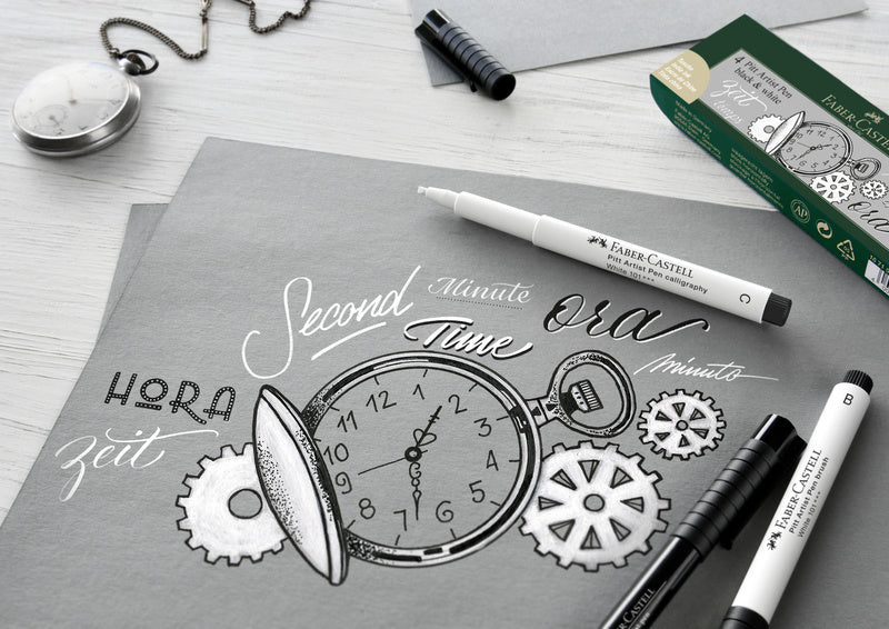 De tekenstift set bevat gepigmenteerde tekeninkt, maximale lichtechtheid en is waterbestendig, permanent, geurvrij, zuurvrij en pH-neutraal. 4 lijnbreedtes in de etui: B = brush punt. 1,5 mm bullet punt, C = kalligrafiepunt in wit. S = 0,3 mm in zwart. Ideaal voor op donkere papiersoorten.
