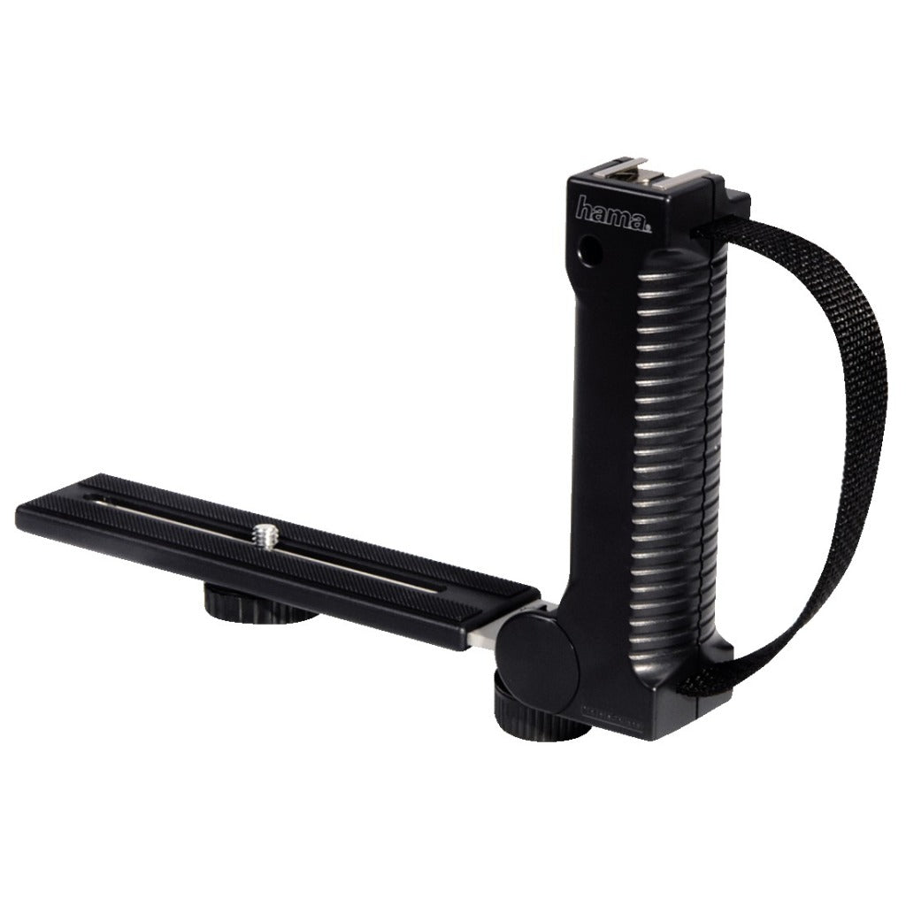 Opvouwbare flitsbeugel met draagriem en accessoireschoen. B 1/4 (6.4 mm) camera schroef en een 1/4 (6.4 mm) statiefaansluiting.
