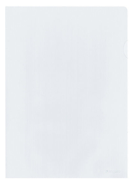 L-map van stevige kwaliteit transparant PP 120 mµ, generfde uitvoering, copysafe en antistatisch. De map is aan de boven- en rechterzijde open en is voorzien van een duimgreep. Formaat A4, verpakt 10x10 stuks.