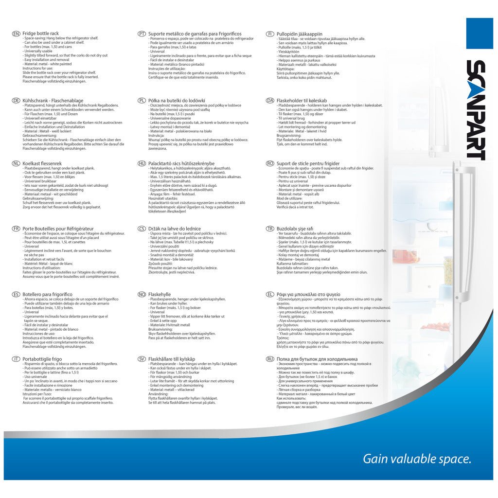 • Plaatsbesparend: schuif het flessenrek over uw koelkast (of kast) plank