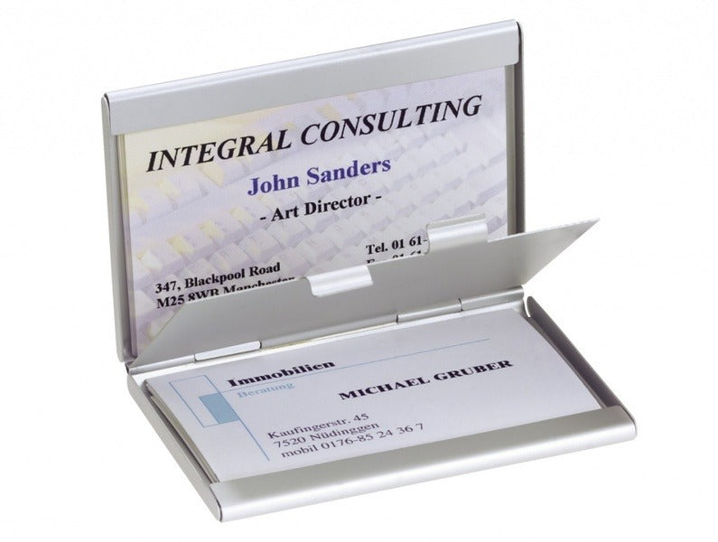 Elegante visitekaartetui Twin gemaakt van hoge kwaliteit aluminium, met 2 vakken voor je eigen en andere visitekaartjes. Ideaal voor onderweg. Mooi design met een mat oppervlak. Voor max. 30 kaartjes (max. 90x58 mm).