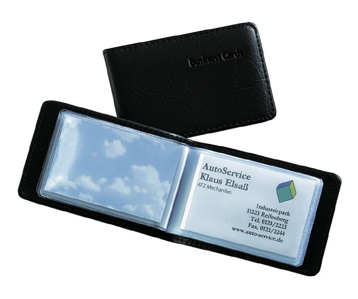 Map voor visitekaartjes in lederen uitvoering. Zwart. Mat. Met 20 doorzichtige showtassen. Kunststof. Voor max. 40 kaartjes (max. 90x58 mm).