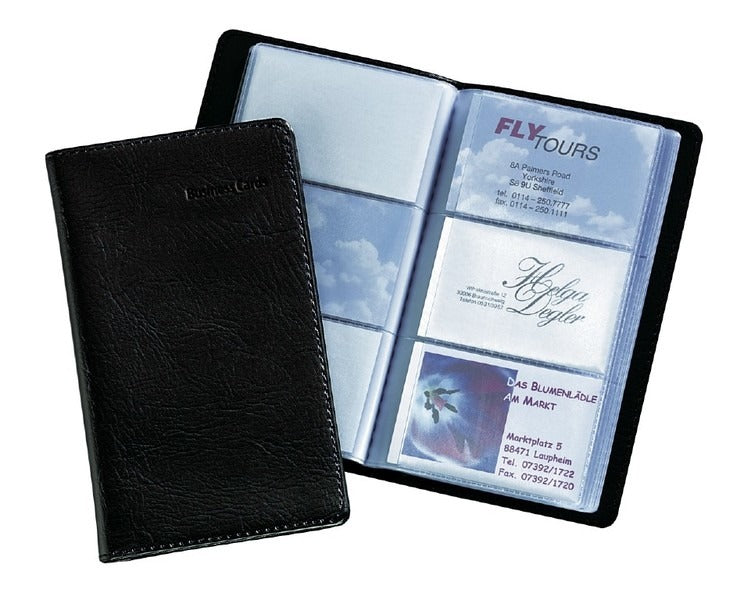 Map voor visitekaartjes in lederen uitvoering. Zwart. Mat. Met 20 doorzichtige showtassen. Kunststof. Voor max. 120 kaartjes (max. 90x58 mm).