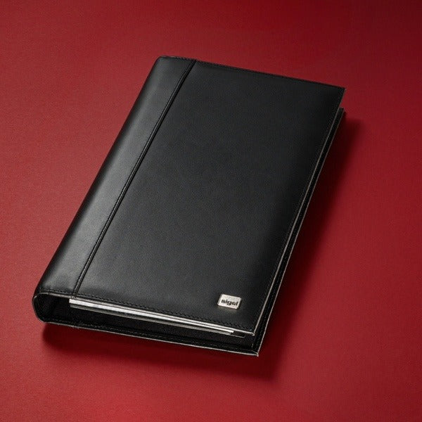 Visitekaartringband. Leer Torino. Zwart. Met 20 doorzichtige showtassen. Register A-Z. 4-rings mechaniek. Nappaleer. Voor max. 160 kaartjes (max. 90x58 mm).
