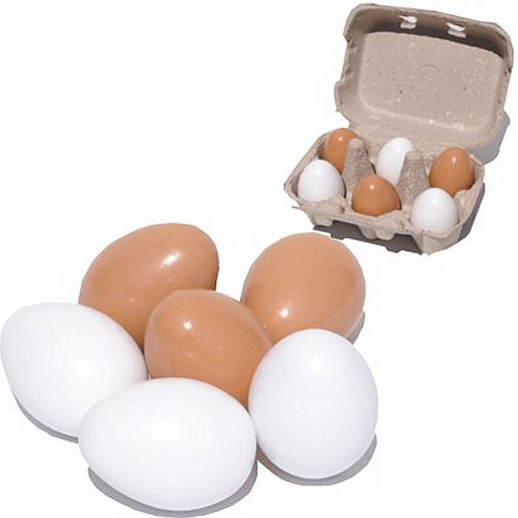 6 Eieren (3 wit, 3 bruin) in een doosje. Deze eieren mogen niet ontbreken in de speelgoedkeuken of winkeltje.